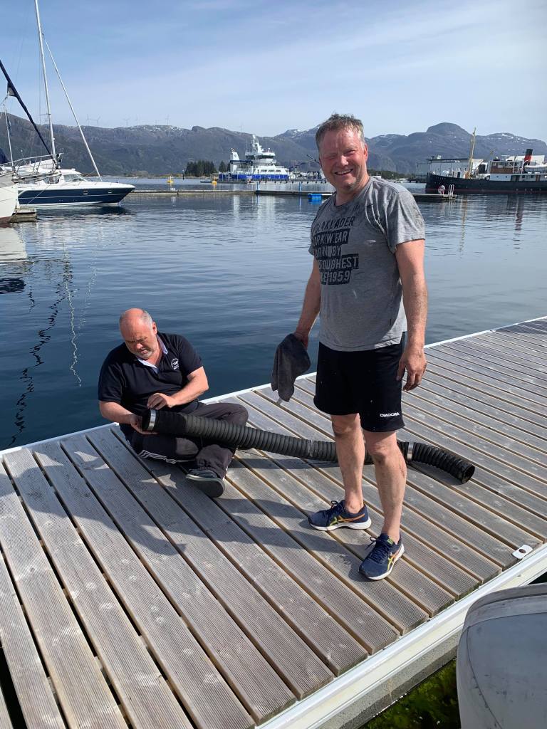 Snartenkte menn og en fantastisk håndt-langer i Ålesund, gjorde at vi kom oss avgårde i dag. Tusen takk til Arne som handlet deler og sendte de meg Hurtigruta fra Ålesund til Florø. Og tusen takk til Yngve som i flere omganger måtte skitne seg til for å hjelpe til å få dette i orden.