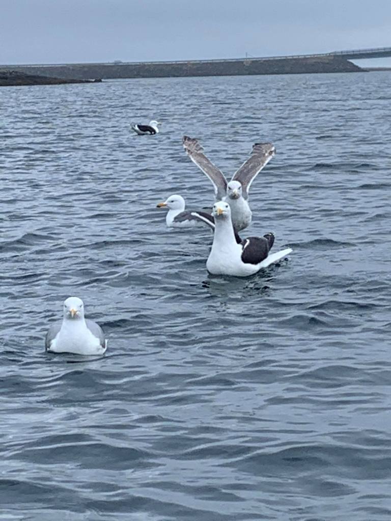 Vi fikk masse torsk. Det tok ikke lange tiden heller. Jeg kunne fortsatt og fortsatt, men heldigvis har jeg en mann som stoppet meg i tide. Måkene var også glade for at vi kom og håpet å få en liten bit av fangsten.