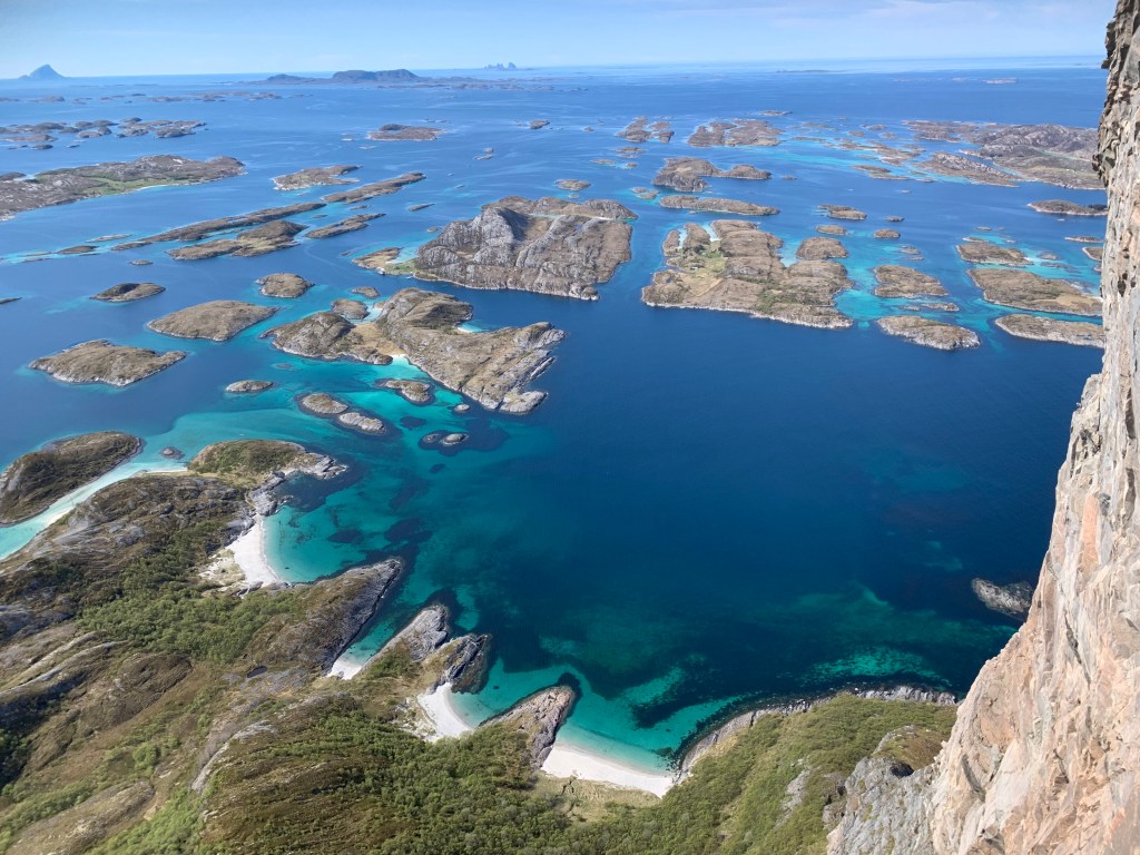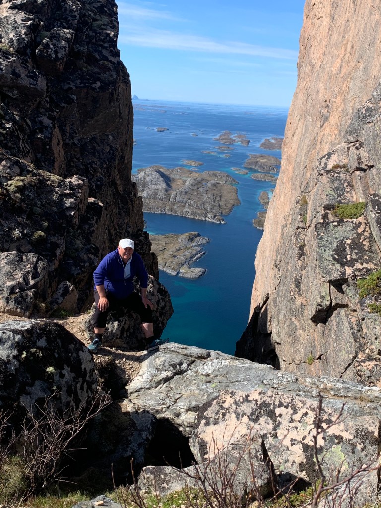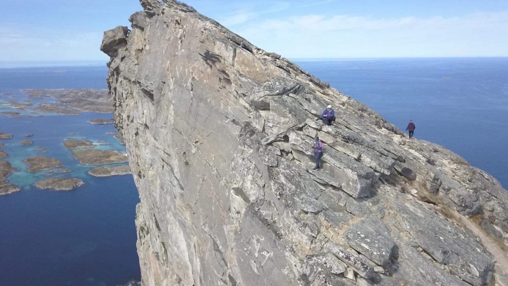 På toppen er det 460 meter rett ned i fjæra. Mye av steinen her er det vi gjerne kaller «råtestein». Man tenker at dette kan lett rase ut….