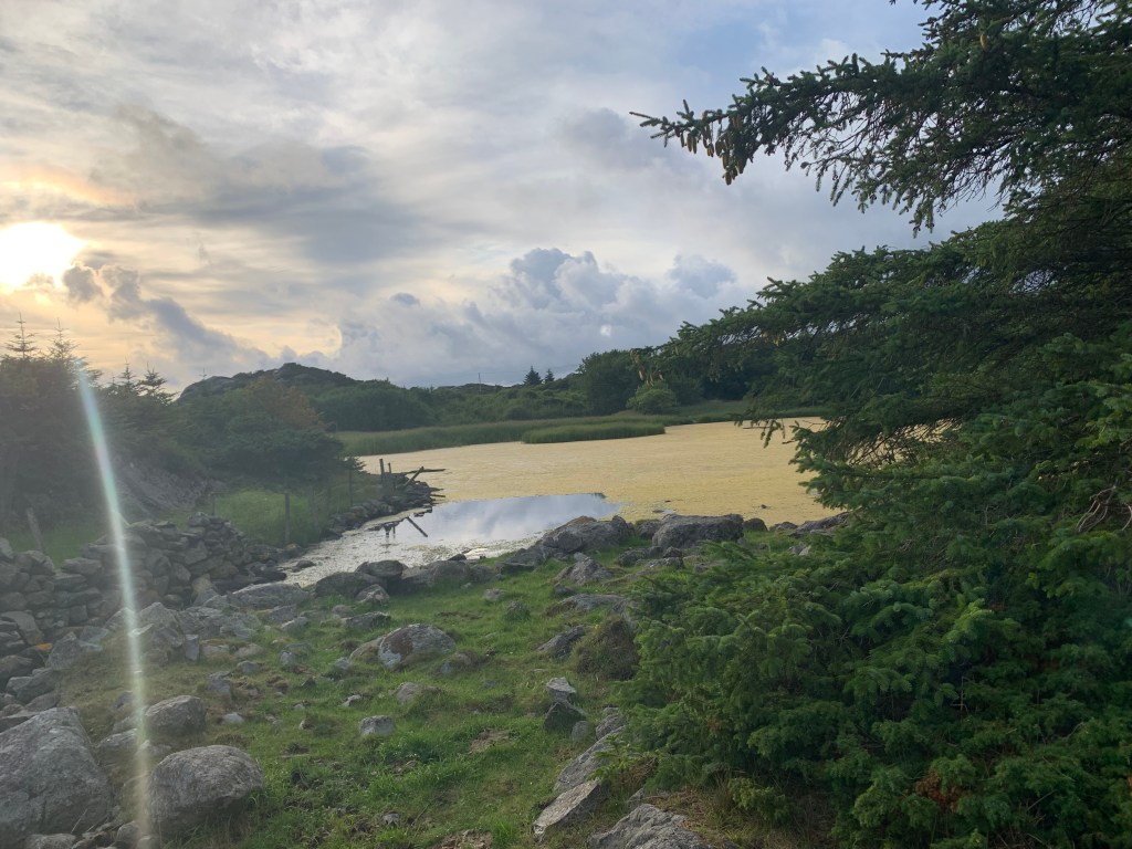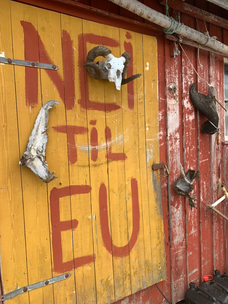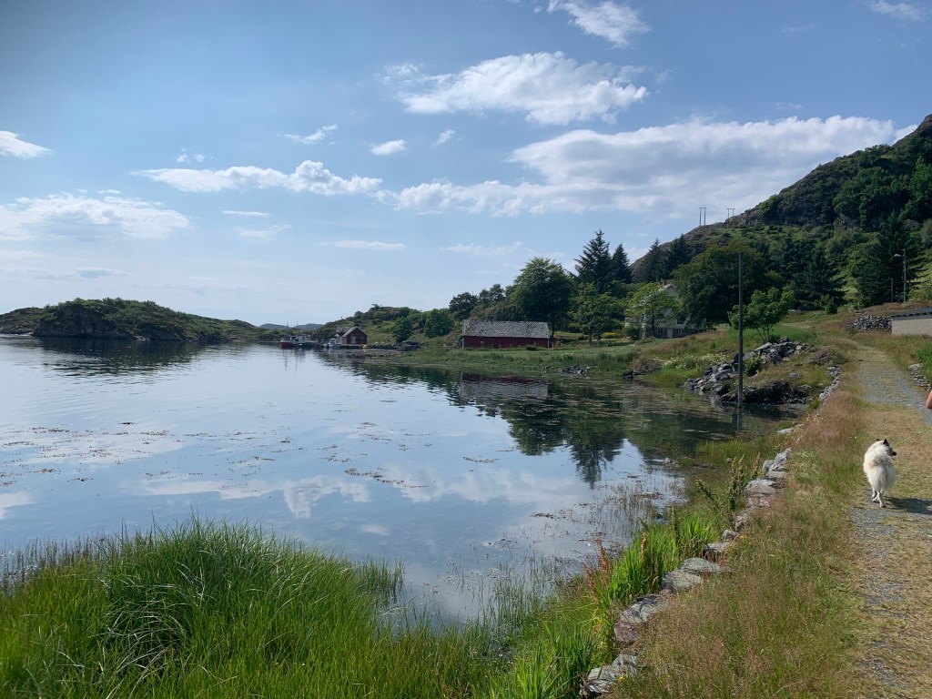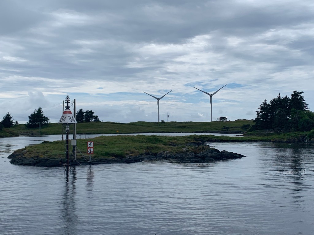 Fitjar var nydelig. Det som vi ser når vi kjører til Bergen er de 55 vindturbinene som faktisk kan forsyne hele Sunnhordaland med strøm, under optimale forhold. Vindturbinene er nesten 90 meter høye og det ble voldsom diskusjon i bygda da disse ble satt opp, om turområder ble rasert. Nå påstår flere at det motsatte har skjedd. Flere mennesker kommer seg ut på tur og bruker veinettet som ble lagt under oppføringen.